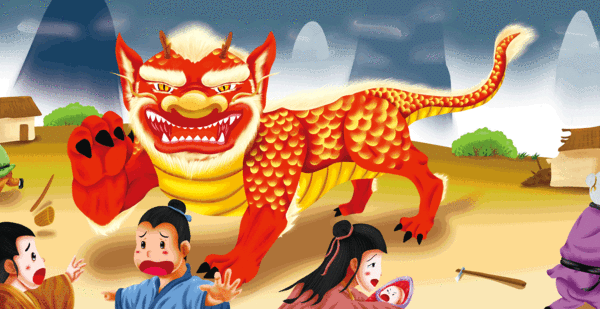 Orang kampung menakutkan dan menghalau Raksasa Nian yang ganas dengan suara kuat, lampu terang, dan warna merah.